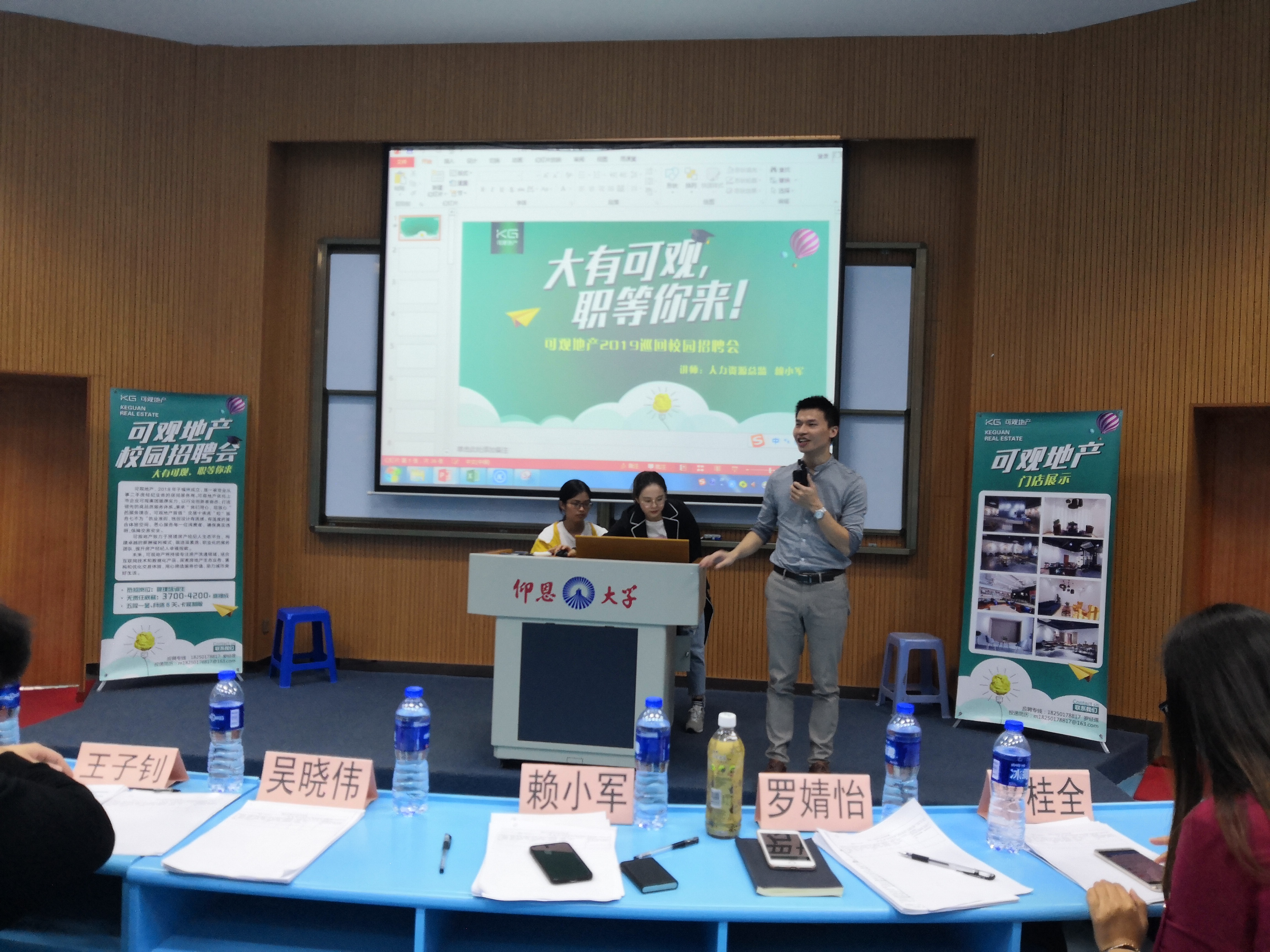 首先,可观房地产有限公司招聘主管罗婧怡分享了其对职业规划的看法,并就自身经历提出了在应聘会上需要注意的问题,强调要针对应聘岗位来突出自己的优势,鼓励大家找对自己的就业方向。随后,可观房地产有限公司人力资源总监赖小军从公司概况、企业文化、企业员工培养模式、业务模式等方面作了详细的介绍。让同学们对公司文化有了一定了解。