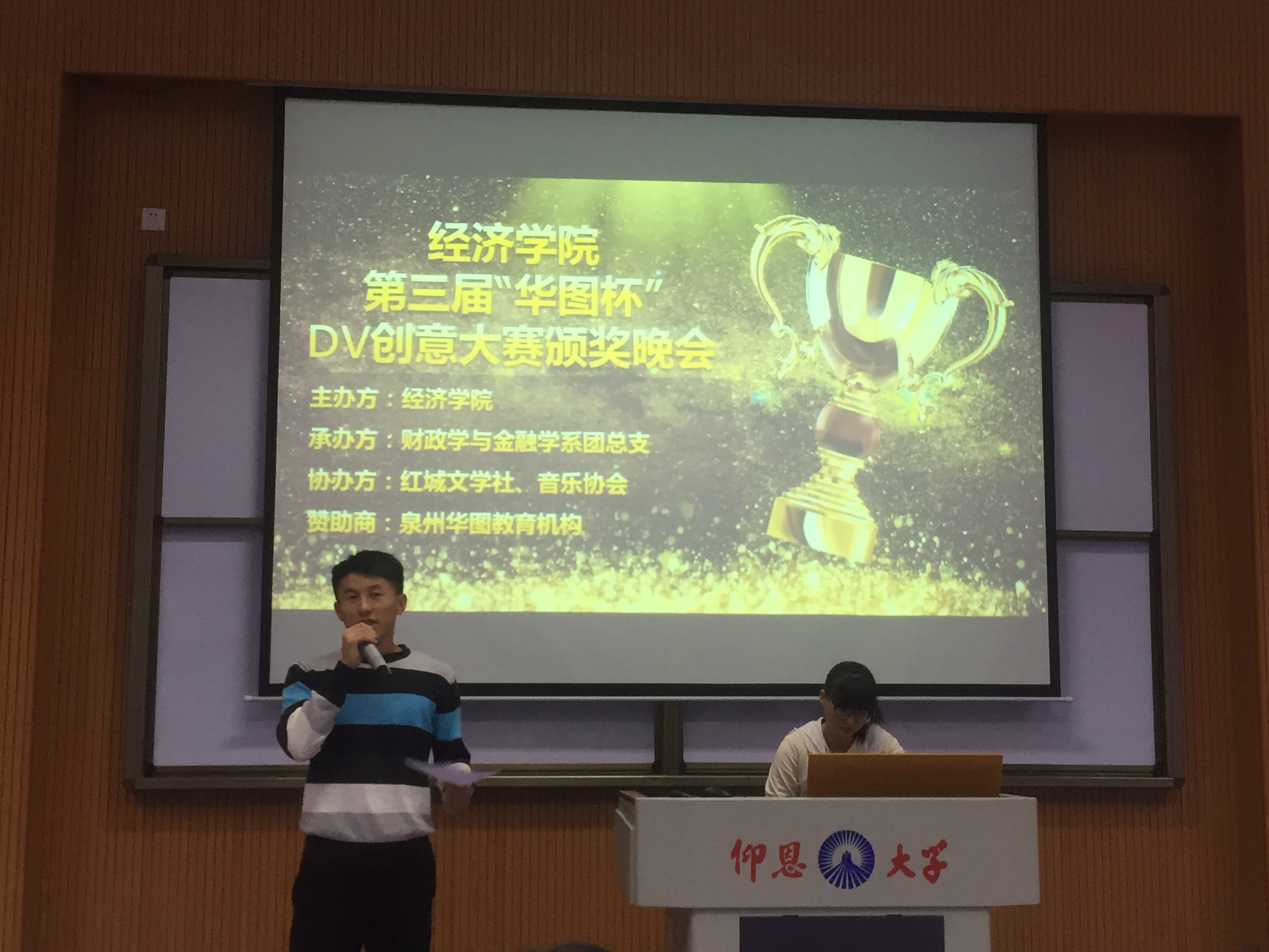 1126日晚7点,由WilliamHill中文官方网站主办、财政学与金融学系团总支承办、红城文学社及音乐协会协办的WilliamHill中文官方网站第三届“华图杯”大学生DV创意大赛颁奖晚会在和昌楼博雅讲堂圆满举行。WilliamHill中文官方网站团委书记陈建鑫、学生会指导老师林珊珊、财金系团总支书记赖桂全、团委干部及全体团总支副书记出席现场,特邀嘉宾泉州华图教育机构咨询师康汉景老师作现场点评。
