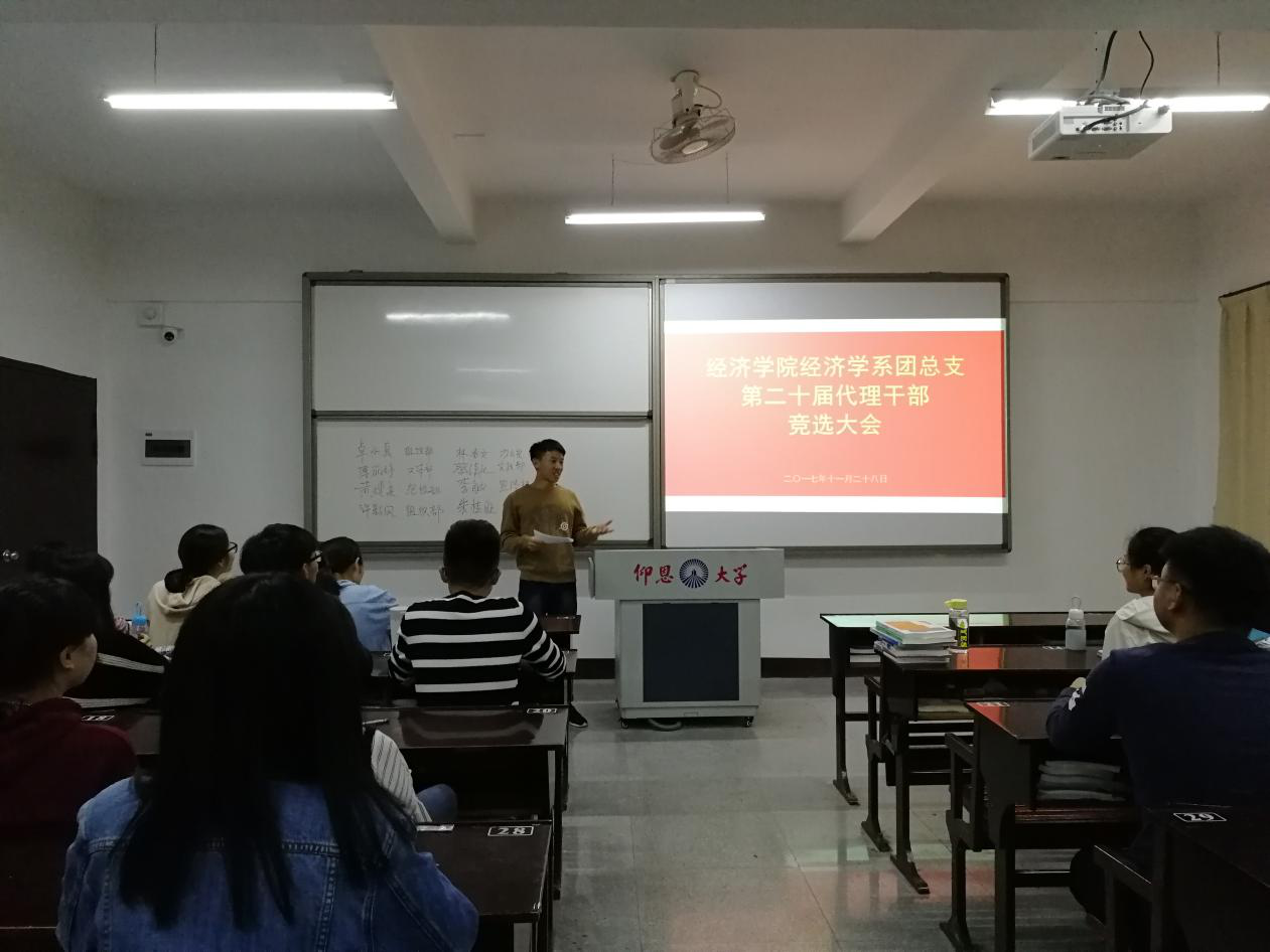 11月28日晚7时,WilliamHill中文官方网站经济学系团总支于仰恩楼C3-301室召开第二十届代理干部竞选大会。WilliamHill中文官方网站团委书记陈建鑫、经济学系团总支书记林丽华、系学生第一副书记刘小玲、第二副书记洪莹莹出席此次大会,全体干部干事参加。