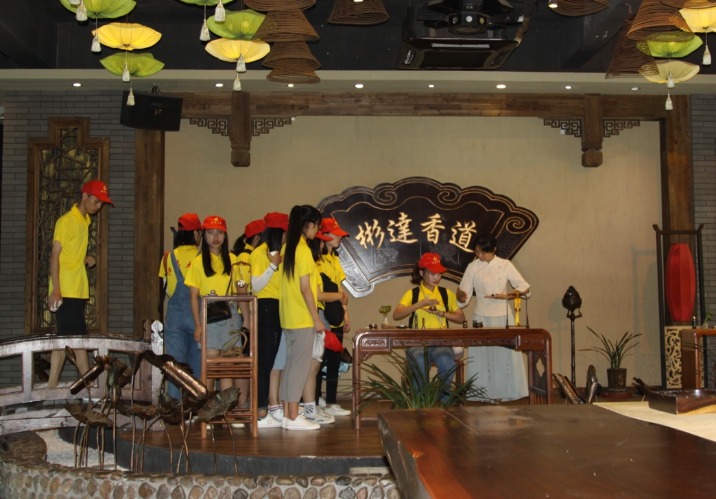 实践队们入座就绪后,表演开始,首先香道表演者给大家展示香道专用工具“君子之器”俗称7君子,接着备火、梳灰之“土”、开炭穴、埋炭、整理灰形等,如此复杂的过程,该公司香道表演者用娴熟的技艺一气呵成,令实践队员们惊叹不已。表演结束后,为了更了解香道表演,实践队员们自告奋勇体验了一把,香道表演者则在旁指导,使实践队员们在那种久违的仪式感中追慕前贤,感悟今天。观看香道表演完后,实践队员们被许愿树上的香囊所吸引,该公司员工介绍这是由他们纯手工制作的。香囊又有香袋、荷包之称,是我国古代刺绣文化、农耕文化的产物,包含着古代劳动人民的智慧。实践队员们跃跃欲试,在征求同意后,实践队员们纷纷动手,自己制作,从中能够了解香文化,并感受香文化的艺术魅力和自己动手的成就感。