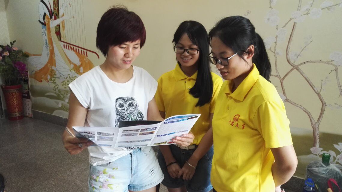 活动开始,实践队成员分为四个小组在公园内及公园周边的商店分发招生手册进行宣传,在宣传过程中,针对有意向报考的家长及学生,实践队员就学校发展概况、专业特色、设施规模、学科师资、办学特色和优势等几个方面并结合宣传手册进行详细介绍,对于家长、学生的问题,队员也耐心解答,并始终保持谦逊有礼,得到路人们的赞许。