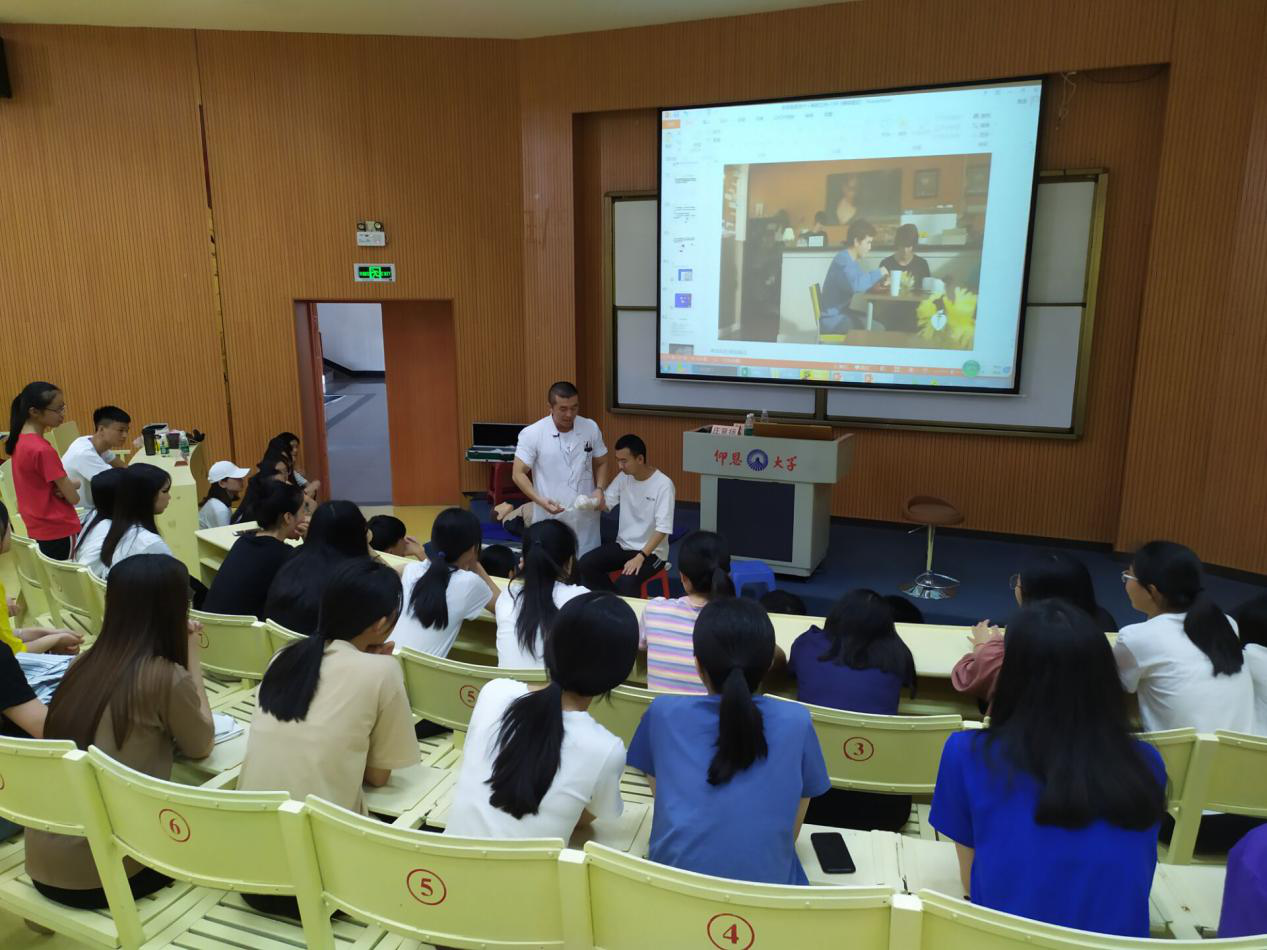 (图为庄竟扬医生在现场讲授外伤急救知识) 为激发同学们的学习兴趣、增强急救自救知识的学习效果,本次讲座主要以现场演示讲授为主。讲座分两个小场进行,一场是由庄竟扬医生在教室内给同学们现场演示如何进行外伤的包扎急救,庄医生结合自身多年的工作经验,向同学们边讲授要点知识,边找现场的同学进行演示;另一场主题是心肺复苏知识学习,主要由三位医护人员在室外进行心肺复苏技能的讲授与演示,同学们分组并一一根据医护人员的指导进行现场实践。