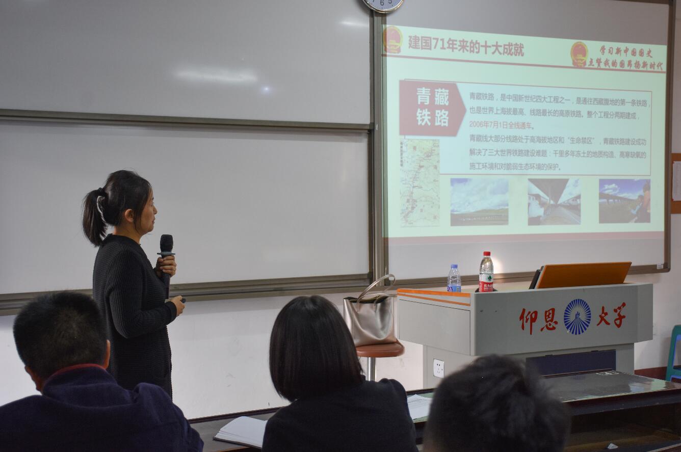 本次党课以“学习新中国国史,点赞我的国昂扬新时代”为主题。党课内容分为六个部分,分别是新中国国史发展脉络,建国以来的十大成就、圆梦工程、生活巨变和历史启示,点赞我的国,奋进新时代。首先,杨娣为党员们梳理了新中国发展至今的脉络,说明了学习新中国国史的重要意义。随后,她向党员们介绍了新中国发展的十大成就、圆梦工程和生活巨变,让到场师生感受到了新中国发展之迅猛、国力之强盛。党课的最后,杨娣用革命先驱李大钊先生的一句话:“无限的过去都以现在为归宿,无限的未来都以现在为渊源。”作为建国71年的历史启示,希望师生们在今后的工作中能立足岗位,率先垂范、以身作则,带头坚守初心、勇担使命。