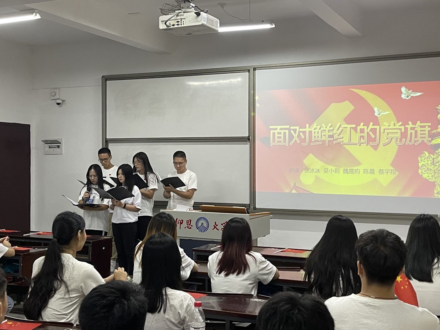 活动伊始,团支部全体团员在主持人带领下共同回顾党史,中国共产党始终不忘初心,高举旗帜,奋勇前进,活动在共青团团歌《光荣啊,中国共青团》的合唱歌声中达到了高潮。紧接着,团员代表先后带来了主题节目诗歌朗诵《面对鲜红的党旗》,并合唱红歌《我和我的祖国》,在歌颂祖国的同时,向祖国传达了深沉爱意。在党团知识抢答环节,团支部团员热情高涨,踊跃回答,将活动氛围再次点燃。活动最后,全体与会团员在主持人带领下,重温入团誓词,青年意识觉醒,有目标有方向,肯吃苦肯奋斗。
