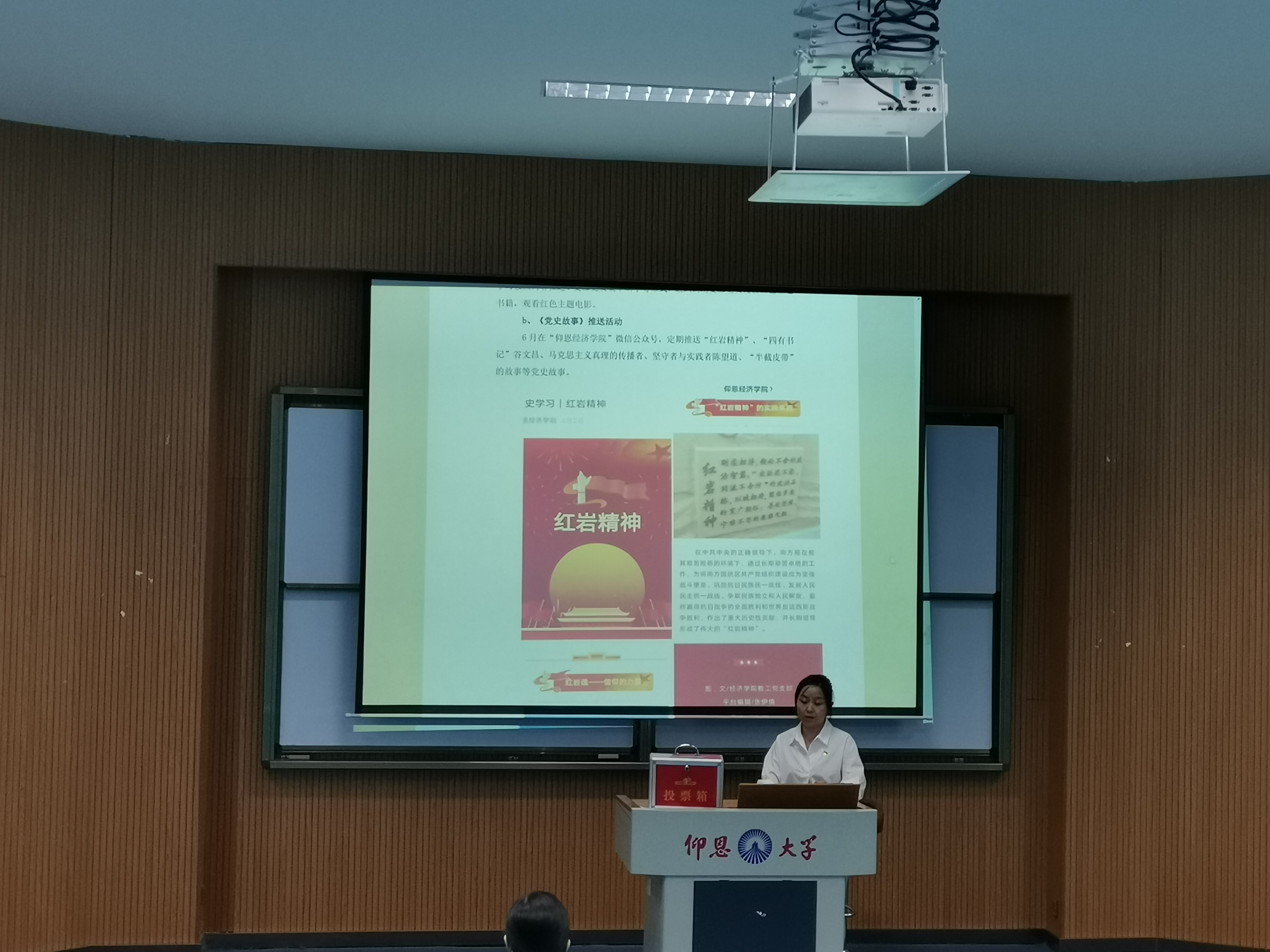 图1 教工支部杨娣同志做工作报告 金融系学生第一党支部支委换届工作会议在博雅讲堂举行,支部应到会有选举权的正式党员共17人,实到会正式党员共17人,超过应到会人数的五分之四,符合法定人数。此次会议由何丽玲同志主持开展,孙保献同志代表上届支部委员会做工作报告,支部全体成员听取并审议工作报告,随后公布支部换届流程,确定候选人名单,发放给党员同志选票,收回有效选票,由党员同志进行现场唱票,最后确定支部此次换届的最终名单并给予公示。