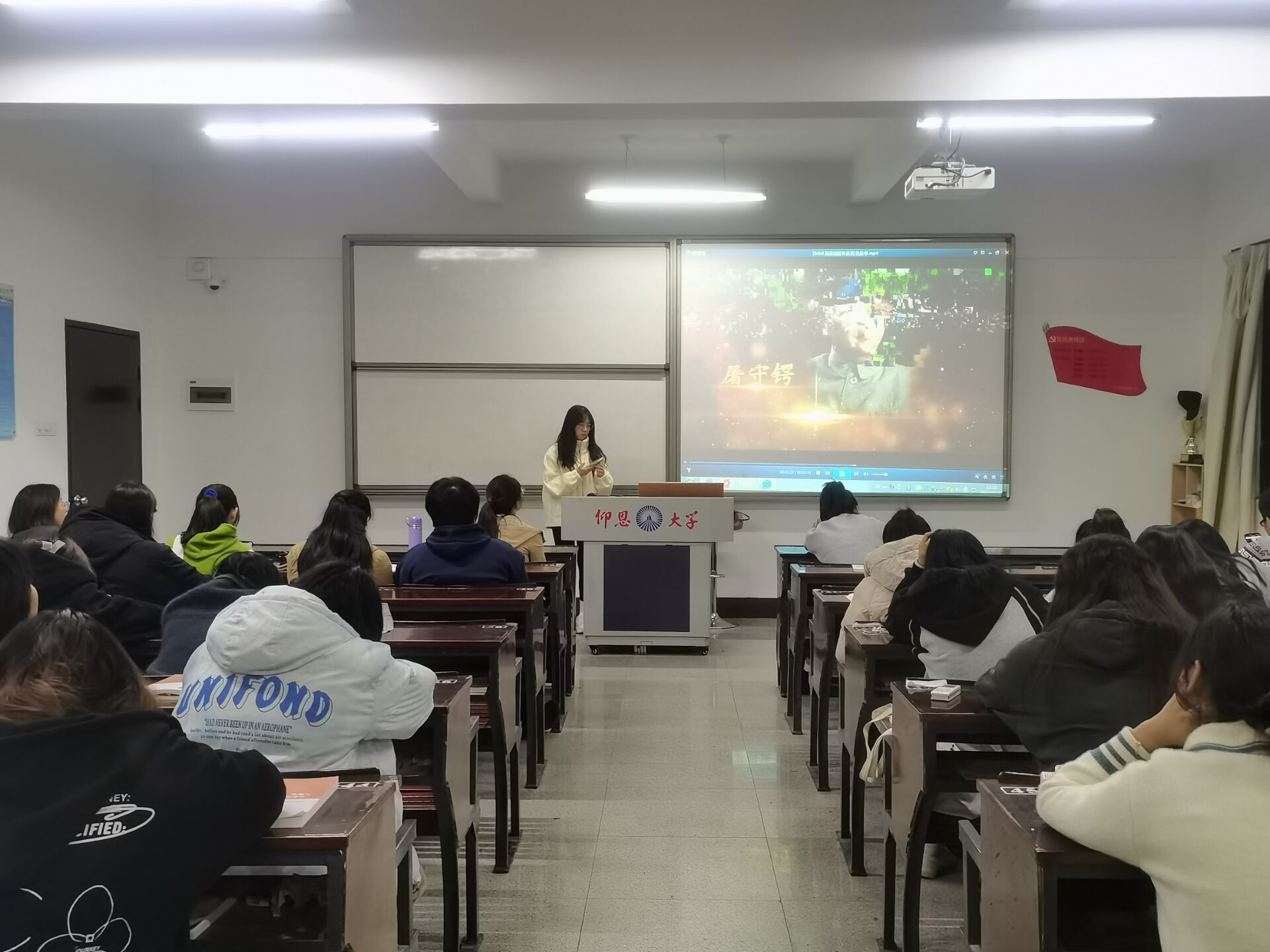 图1 同学进行诵读 会议开始,活动开始,各班安排一名同学进行分享,每位同学均准备了感人的红色故事,及具有教育意义的红色短片,为大家带来一场声情并茂的朗诵。
