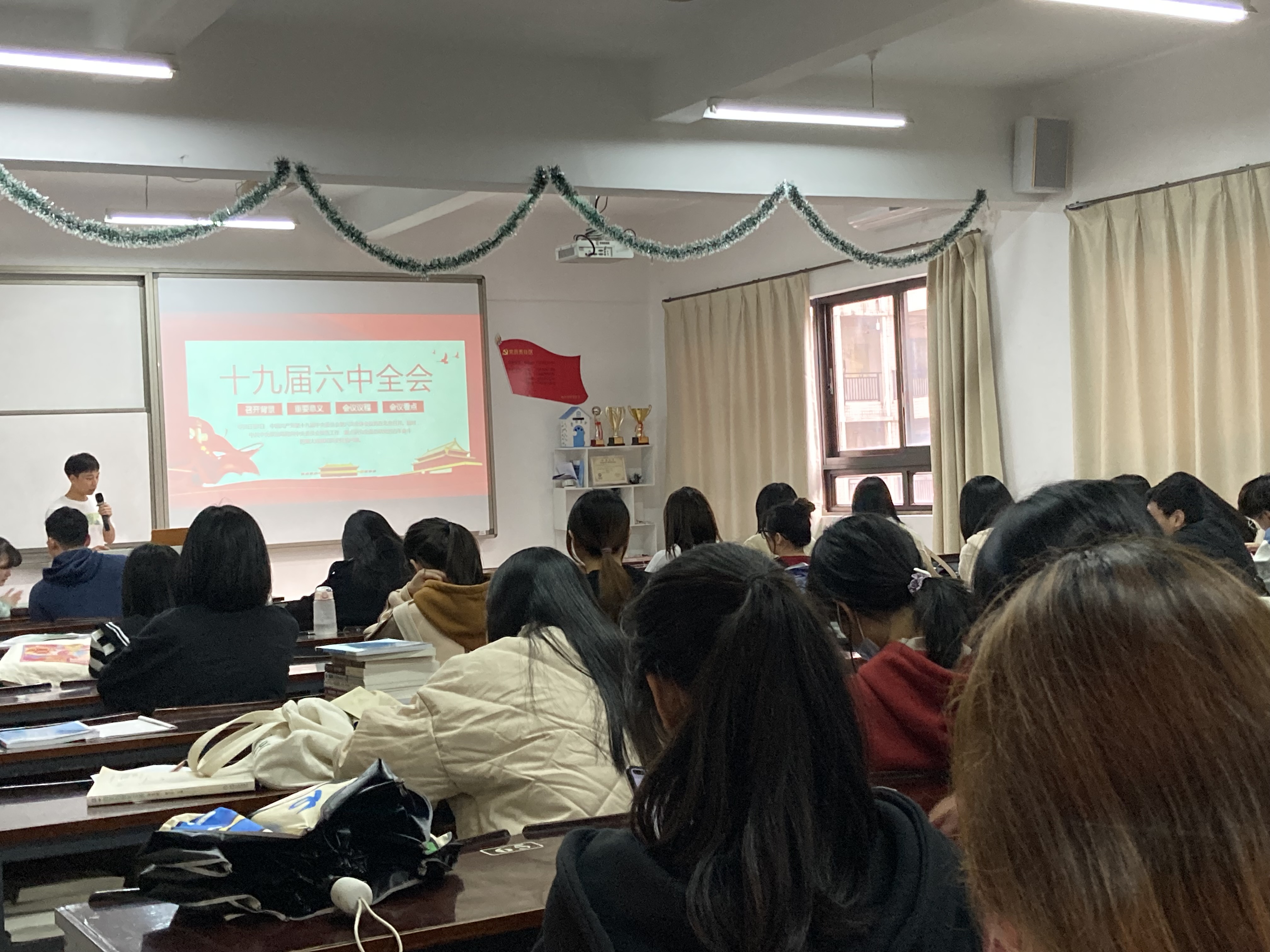 2021年12月13日,经贸系学生第一党支部于仰恩楼B2-205开展关于党的十九届六中全会精神解读交流研讨学习会,参加本次会议的有经贸系第一党支部全体党员及积极分子。