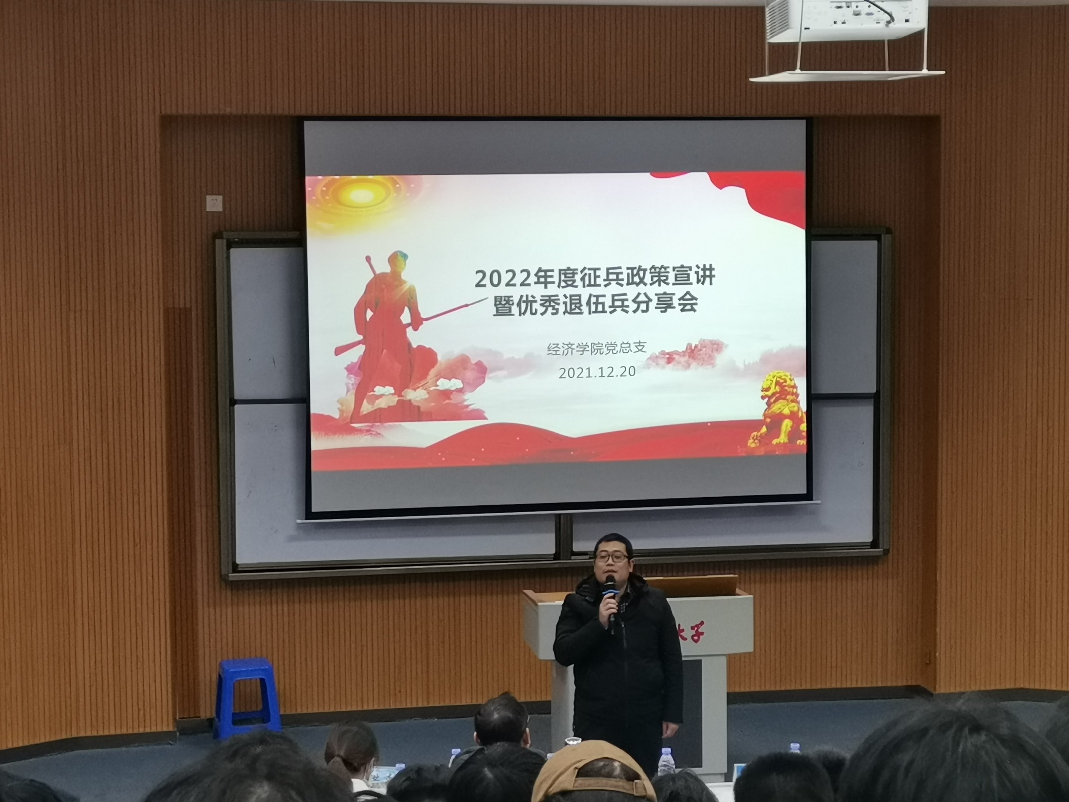 为积极响应大学生征兵政策,激发广大学生的参军热情,2021年12月20日晚,WilliamHill中文官方网站党总支征兵宣传会暨优秀退伍兵分享会于新区和昌博雅讲堂举行,WilliamHill中文官方网站全体男生参加此次会议。