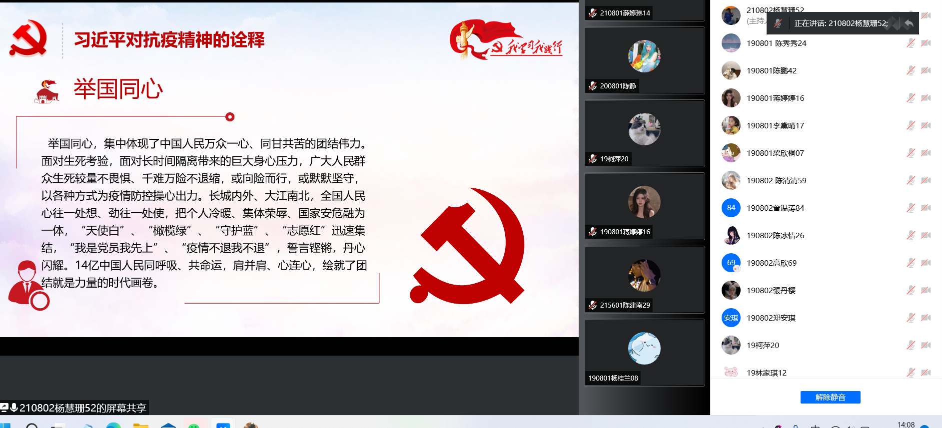 本次活动采取线上的方式,其主要内容大致分为三个部分——抗疫精神的阐述、习言习语(习近平对抗疫精神的诠释)和抗疫精神的具体体现。主讲人结合PPT演示指出,伟大抗疫精神是指生命至上、举国同心、舍生忘死、尊重科学、命运与共的精神。其抗疫精神要点,一是万众一心、同舟共济的守望相助精神;二是闻令而动、雷厉风行的英勇战斗精神;三是顾全大局、壮士断腕的“一盘棋”精神。而后从习总书记有关疫情防控的讲话入手,学习习总书记抗击疫情的决心和其生命至上的人本精神。最后以抗疫具体事迹、具体体现出发,感悟我国14亿多中国人民同呼吸、共命运,肩并肩、心连心团结一致共克时艰的伟大民族精神。