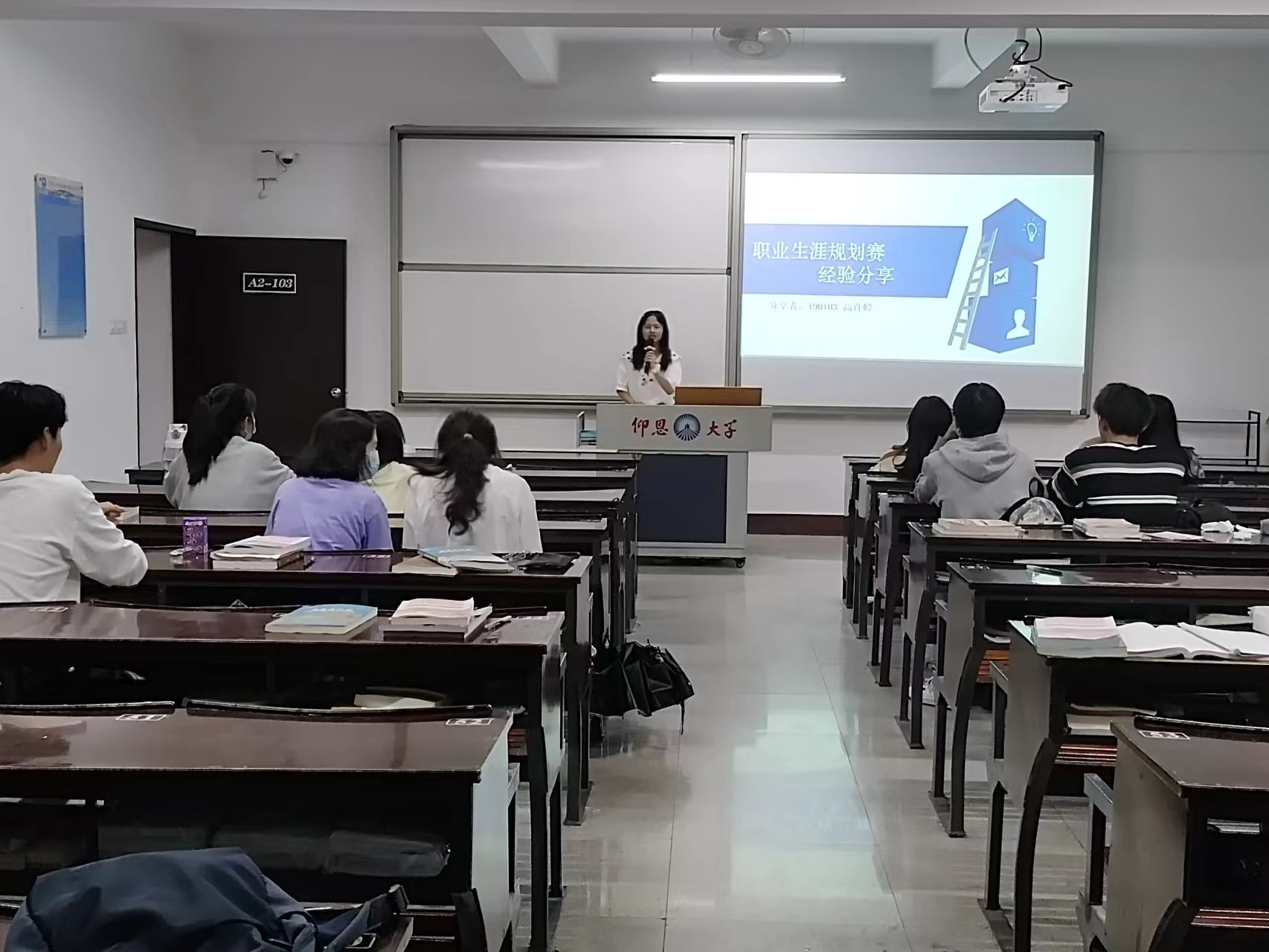图1 高许婷为同学们分享经验 首先,高许婷同学从自我认识、职业认知、职业决策、自我监控、职业规划书等几个方面进行介绍,并以自己的职业规划书为主一一为同学们讲解注意事项,并提出相关建议指导同学们如何做得更好,为职业规划书加分。最后,高许婷同学分享了其以往的参赛经历,针对性地给同学们提出建议。在培训会结束之际,高许婷真诚地鼓励同学们,希望大家都能有出彩的成绩!