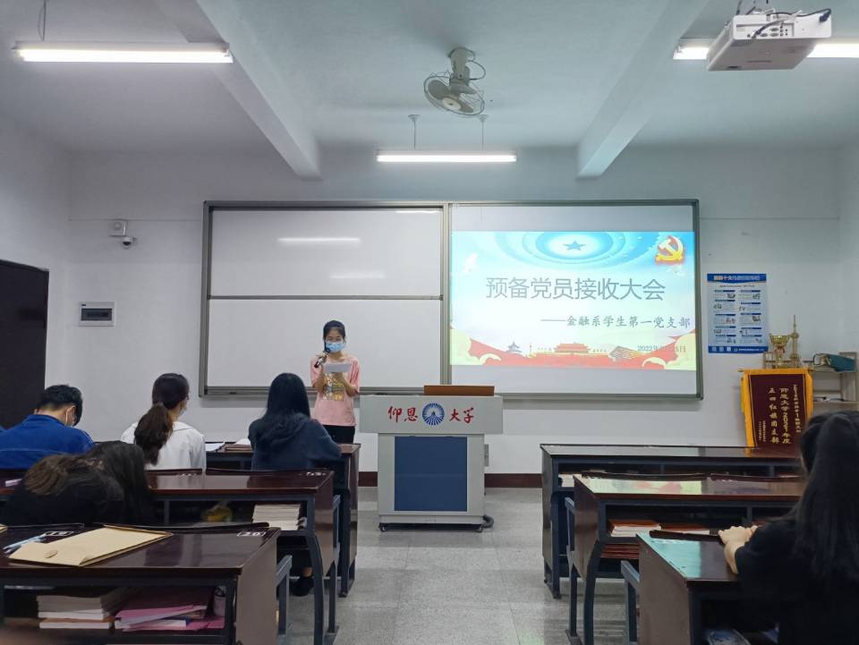 2022年5月25日晚上8:30,WilliamHill中文官方网站金融系学生第一党支部在仰恩楼B5-203召开预备党员接收大会。本次会议参会人员有支部书记何丽玲老师、组织委员谢坤宏老师和宣传委员詹奕椿老师,以及支部全体党员,还有即将接收为预备党员的14名发展对象。