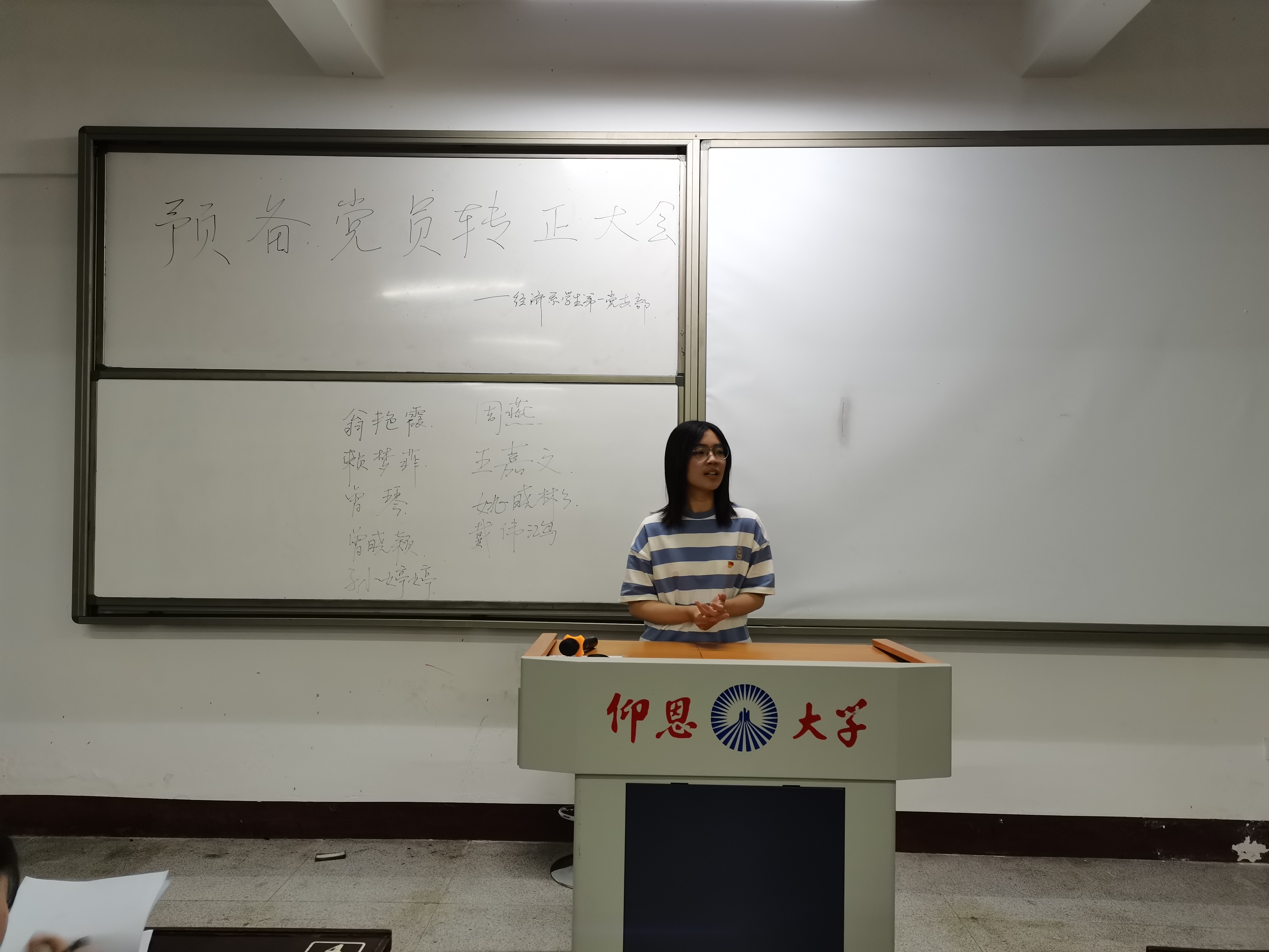 图1 预备党员宣读转正申请书 会议伊始,支部书记宣布党员到会人数情况,按照预备党员转正程序,预备党员依次宣读了自己的转正申请书,并向大会详细地汇报了在预备考察期内思想认识、理论学习、工作生活等方面的表现,剖析自身不足并表达对党的坚定信仰。接着,入党介绍人就预备党员在预备期的表现及教育、考察情况进行评议并提出建议。随后,支部书记代表支部委员会向大会汇报预备党员在预备期间的教育考察情况和审查情况,并提出了转正意见,全体与会党员同志对预备党员进行充分讨论。经党员大会无记名投票表决,同意经济系学生第一党支部9名预备党员转为中共正式党员。预备党员依次进行了表态发言,表示将在今后的工作和生活中,时刻以一名共产党员的标准来严格要求自己。会议最后,由支部副书记姚姝然老师做总结讲话,表达了对预备党员的认可和期待。至此,本次预备党员转正大会结束。