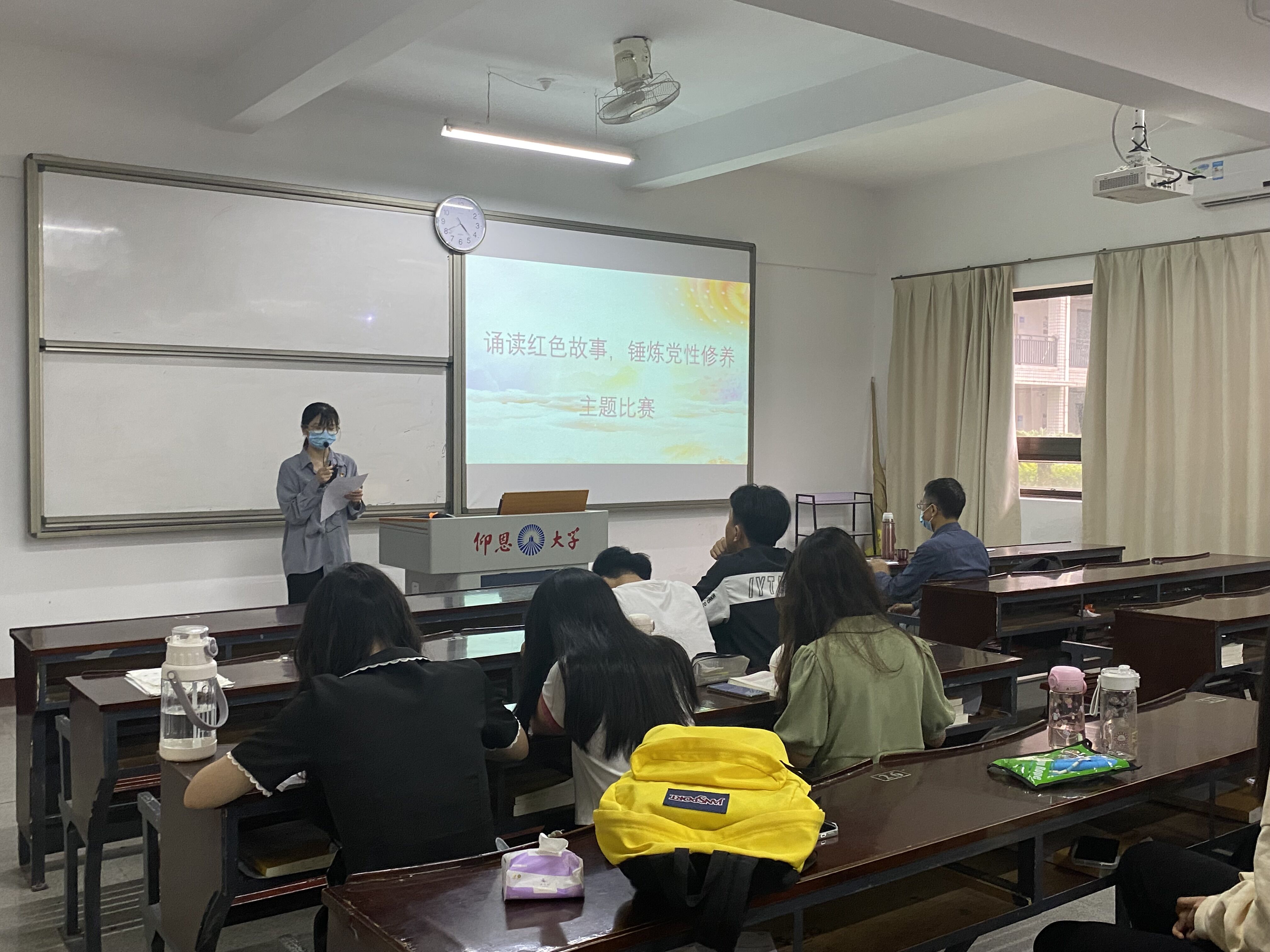 图1 参赛选手正在朗诵红色故事 本次活动在主持人讲述活动内容中拉开序幕。首先,参赛选手通过朗诵的方式,带领与会人员重温红色故事,领略中国共产党人的理想信念、革命实践与战斗情怀。接着,由与会人员作评审团,在经过充分讨论后,评选出各个等次的个人奖项。活动最后,由经济系学生第一党支部组织委员仲平老师对本次演讲比赛进行总结发言,对同学们的表现给予了充分的肯定,同时希望大家能够学习党史砥砺初心,接续奋斗践行使命。