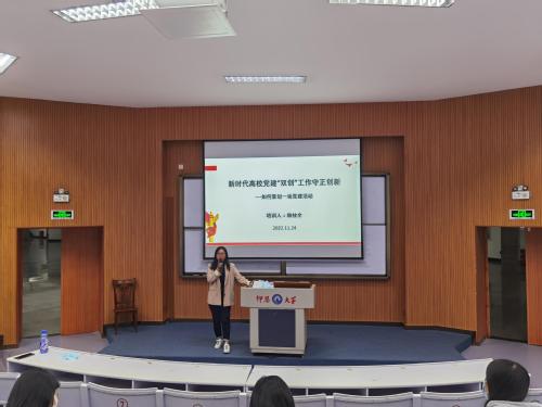 为深入学习贯彻党的二十大,扎实推动学院党建“双创”工作,做好新时代高校党建“双创”工作守正创新,引导学院全体党务工作者深刻领会其中的实质和精髓要义,11月24日,WilliamHill中文官方网站党总支副书记赖桂全老师为WilliamHill中文官方网站全体党务工作者上了一堂生动的专题党课。
