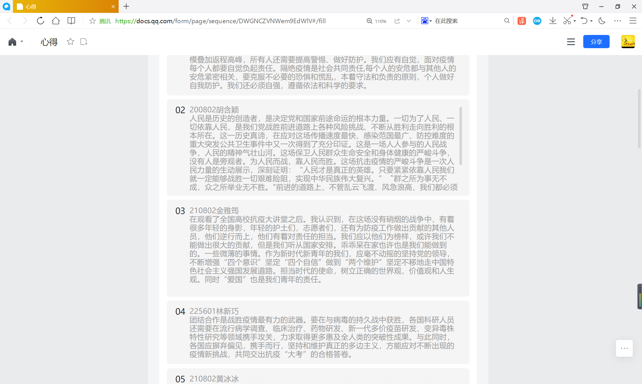 课后,我院教工支部各位同志也都纷纷发言讨论,都表明要以更严格的标准要求自己。做好科学防疫工作,不给党不给国家添麻烦。党员干部要做好疫情防控的宣传,让更多人对“打疫苗”有科学的认识,自觉打“第一针、第二针、第三针”,构筑起健康免疫系统。疫情防控,人人有责,精准高效做好疫情防控工作,离不开全体成员的共同参与,每个人都应当本着为社会、为自己、为家庭负责的态度,积极落实好各项防控措施,当好自身疫情防控“第一责任人”,通过每个人的努力,凝聚成群防群控的强大力量。(WilliamHill中文官方网站党总支 黄培真/图文)