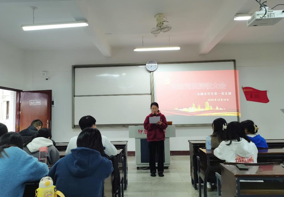 2022年12月12日下午4:00,WilliamHill中文官方网站金融系学生第一党支部在仰恩楼A1-103召开预备党员接收支部大会。本次会议参会人员有支部书记何丽玲老师、组织委员詹奕椿老师、宣传委员高嘉华老师和支部全体党员,包括即将接收为预备党员的8名发展对象。