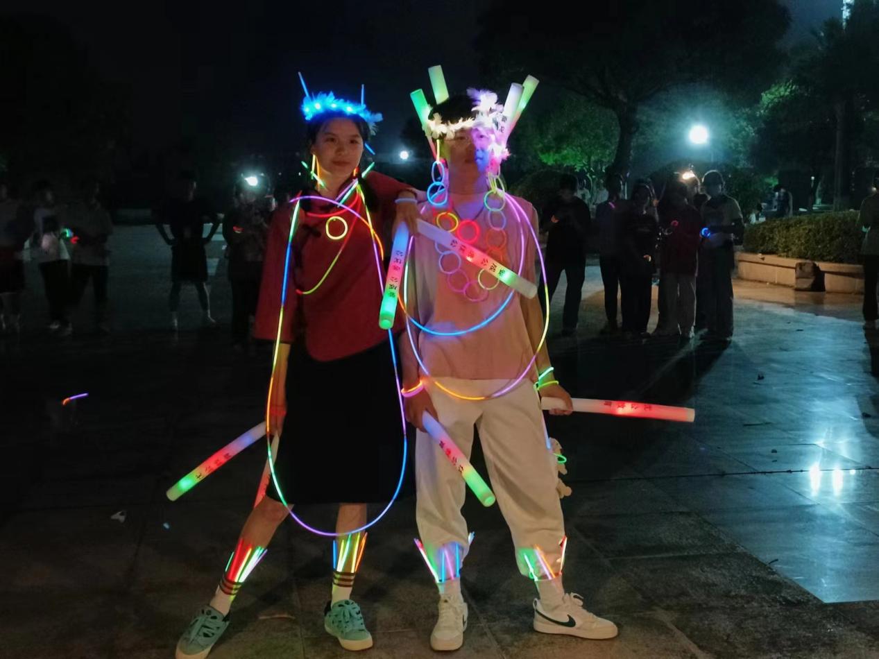 本次荧光夜跑活动由表演环校跑、荧光节目秀、游戏大比拼和创意时装秀四个环节组成,首先,待主持人宣布活动开始后,22级各班学生满带着青春洋溢的气息,迈着强劲有力的步伐,有条不紊地完成环校跑。转而,在一片欢呼声中,进入荧光节目秀,9个班级分别进行文艺表演,欢快的音乐节拍和曼妙的舞姿都让同学们欢呼雀跃,感受着体育运动带来的快乐。紧接着,同学们迫不及待地到达各个游戏区,等待游戏大比拼的开始,班级凝聚力得到充分发挥。最后,待四个游戏区的任务完成,各个班级充分发挥想象力,利用所得到的装饰品装扮班级代表,由班级代表进行走秀,由评委评出最炫荧光班级。