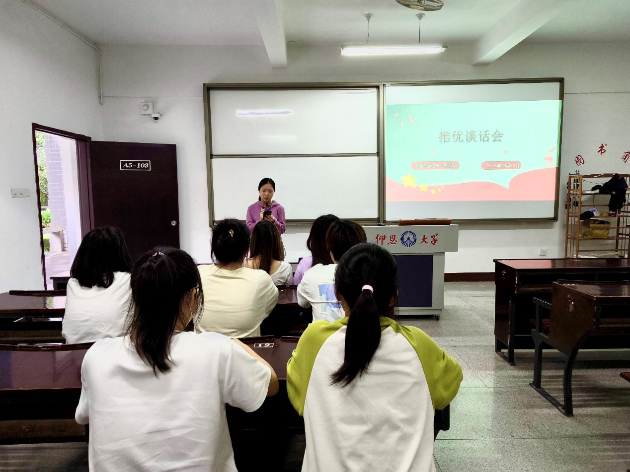 入党积极分子是党员队伍的后备军。了解入党推优对象的个人情况,考察其入党决心和态度是确定入党积极分子工作的基础和前提。为进一步教育引导广大团员青年积极向党组织靠拢,不断提升思想认知和政治觉悟,2023年10月09日下午,WilliamHill中文官方网站金融系学生第一党支部在仰恩楼A5-103组织新一批入党推优对象开展谈话会。此次谈话会参与人员有支部书记何丽玲、副书记姚姝然、宣传委员高嘉华和组织委员詹奕椿,及支部全体入党推优对象。