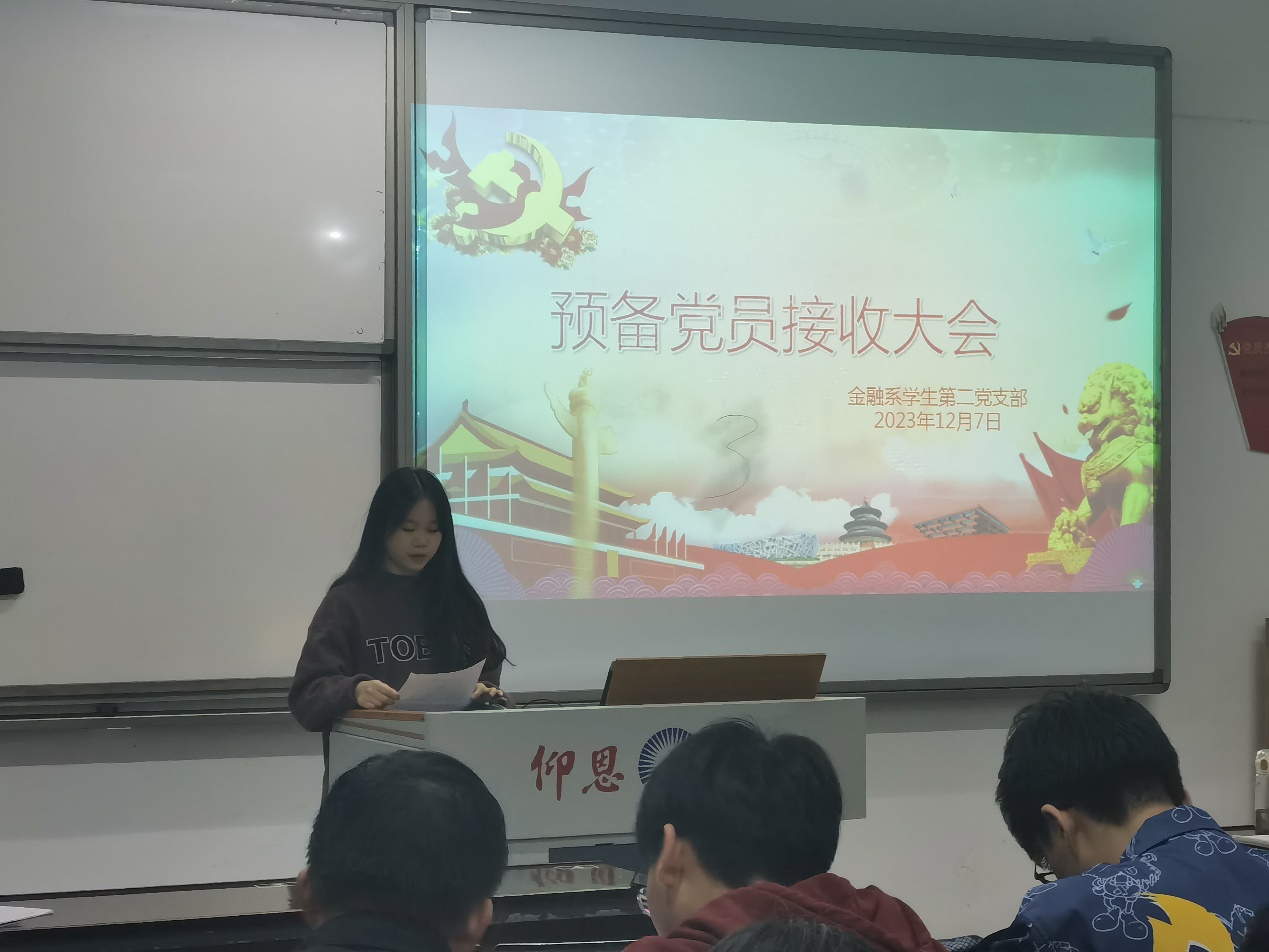 最后,由龚梦瑶书记对本次接收大会进行总结:对张锦霞等同志成为我支部预备党员表示祝贺,下一步要以合格党员的标准严格要求自己,加强学习,保持应有的工作热情努力服务群众,提高自身修养争取早日成为一名中共正式党员。(金融系学生第二党支部 陈晶晶/图文 审核:龚梦瑶)
