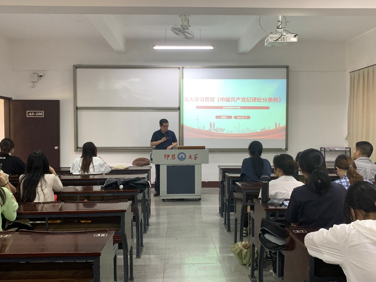 首先,吴晓伟老师介绍新修订的《中国共产党纪律处分条例》的基本内容和学校开展党纪学习教育情况。接着,吴晓伟老师领学《条例》的部分内容,重点从“六纪”进行授课。吴晓伟老师结合党员的工作生活实际,依据《条例》中的处分条款详细解读,要求作为党员要坚决维护党中央权威、对党始终忠诚,维护党的团结统一,坚定理想信念,规范政治言行,明确党员在日常生活和社会交往中应当遵守的行为规则。在吴晓伟老师的讲解下,同学们更加清晰更加全面地认识了党的纪律处分条例,受益匪浅。