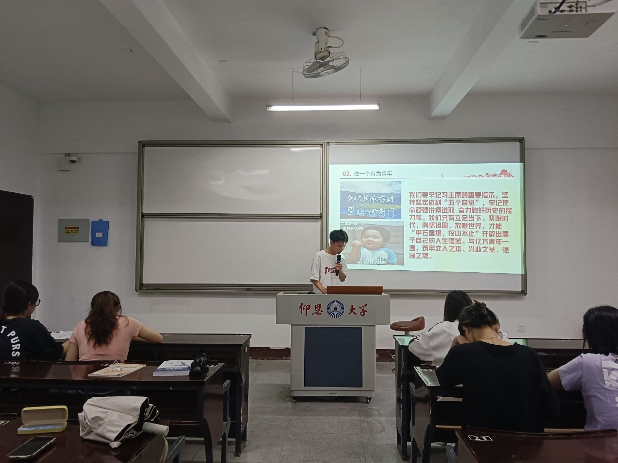学习会上,支部总干事周怡芯同学先阐述了“学习重要指示,争做有为青年”的主题,对习近平总书记的重要指示作出了强调。紧接着,各班积极分子代表们结合生活实际、重要指示、先进事例等方面,对“学习总书记重要指示”“如何做有为青年”展开深刻探讨与感悟分享。其中积极分子代表陈佳炜同学通过视频分享、PPT讲解等形式,对“有为青年”进行全方位、多维度、深层次的论述,以加深全体党员和积极分子对习近平总书记讲话的理解感悟,并且以先进青年干部黄文秀为例,将理论融于基层实践中,坚持从人民群众中来、到人民群众中去,号召广大青年要筑牢立人之本、兴业之基、强国之魂。