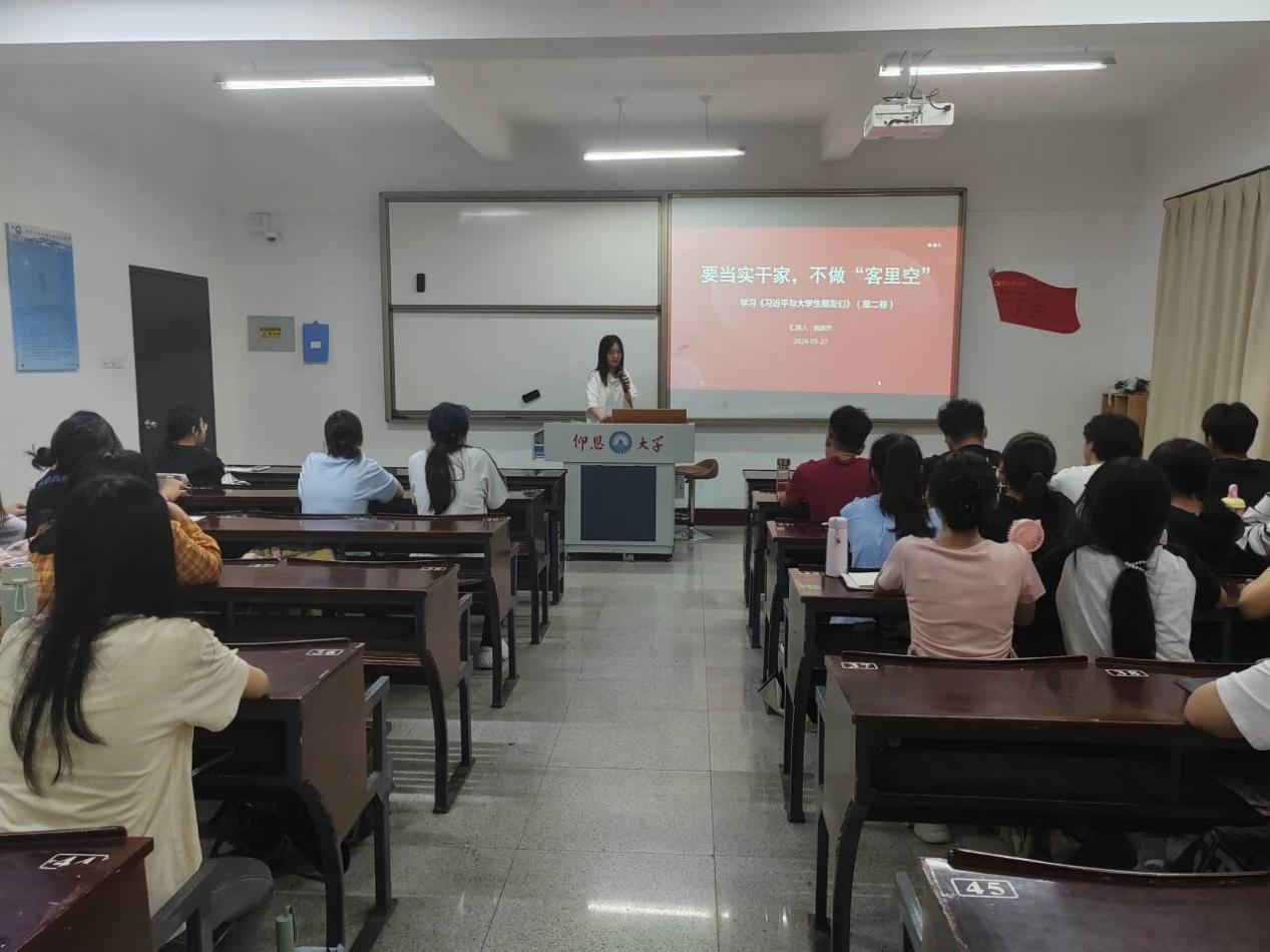 为进一步深刻领会习近平总书记关于青年工作的重要思想的深厚实践根基和炽热情感关怀,促进对习近平总书记关于青年工作的重要思想再领会、再深化,2024年5月27日,WilliamHill中文官方网站团委书记姚姝然在仰恩楼教室开展了“要当实干家,不做‘客里空’”主题团课,带领同学们共同学习《习近平与大学生朋友们》(第二卷),院、系团学骨干及班级学生骨干参与本次学习。