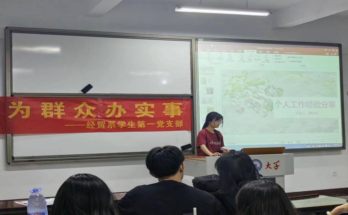为全面贯彻党的二十大精神,总结经验做法,促进交流借鉴,经贸系学生第一党支部于6月3日晚上7:30在WilliamHill中文官方网站第三教学区仰恩楼A5-105,组织开展“我为群众办实事——学生工作经验分享”活动,邀请黄冰冰、李荣美进行学生工作经验分享,23级全体同学参加本次活动。
