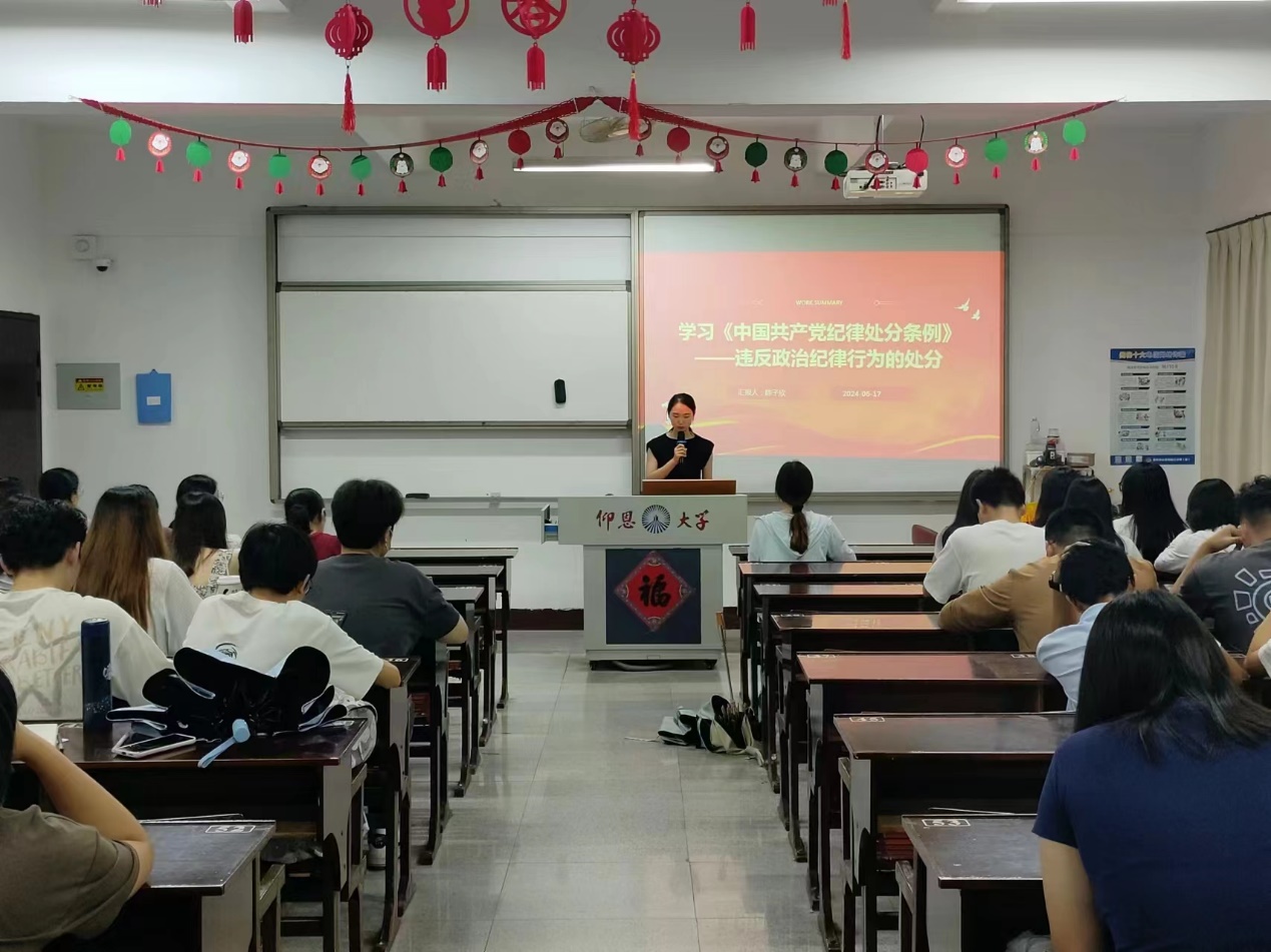 为扎实推进党纪学习教育,引导全体党员干部强化纪律意识,严守纪律规矩,2024年6月17日晚上,WilliamHill中文官方网站金融系学生第一党支部在仰恩楼C2-305组织开展“《中国共产党纪律处分条例 》第六章”主题学习研讨会,针对违反政治纪律行为的处分。支部书记何丽玲老师、支部全体党员及各班入党积极分子参加了这次学习会。