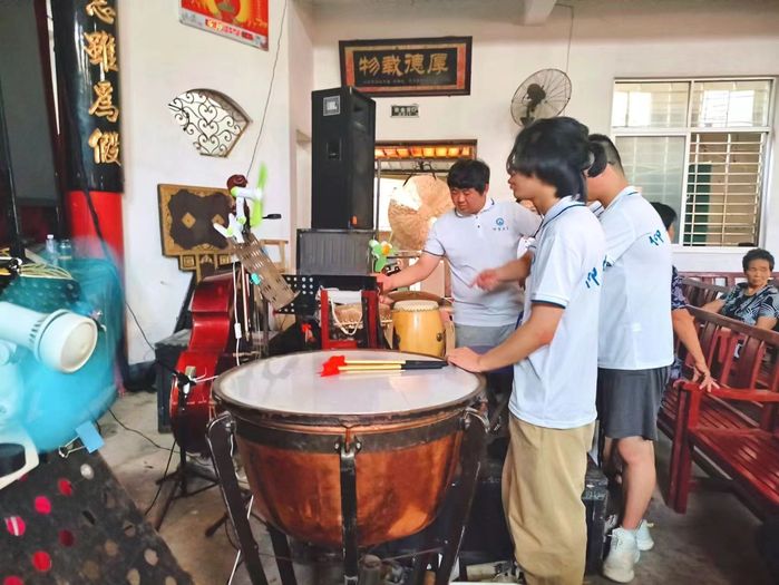 后台参观时,成员们参观了闽剧舞台,左侧乐队阵容中有锣、鼓、杨琴、电子琴、长笛、唢呐、二胡等传统乐器,为现场表演提供音乐支持。后台空间虽显拥挤,但演员个人物品摆放有序,足见剧团良好纪律。调音台和电脑等现代设备的运用,展现出传统艺术与现代技术的融合,成就了独具特色的闽剧表演。
