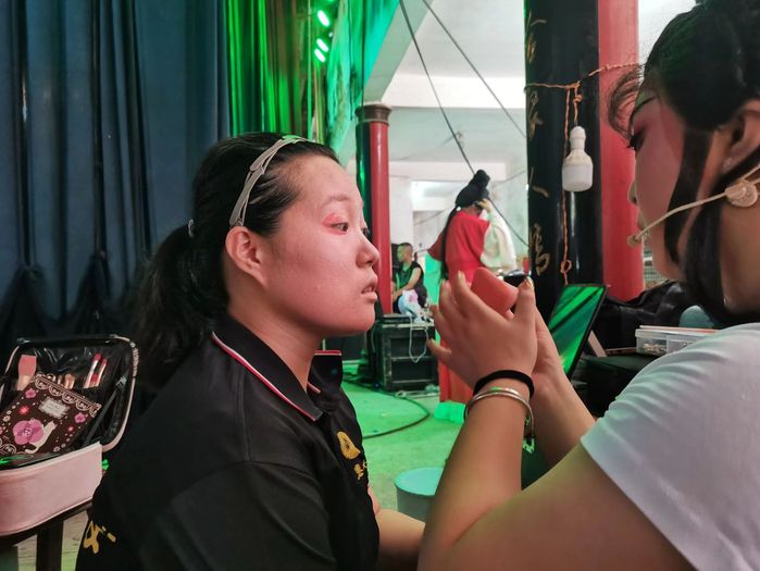 在舞台后场,队员们亲身感受闽剧妆容。闽剧妆容的打造需用油彩,历经打底、上红、扑粉、抹腮红、描眉、画眼线和唇妆等步骤,每一步都彰显传统艺术的精细。耗时近一小时妆造过程,让成员们深切领略到闽剧妆造的独特魅力。