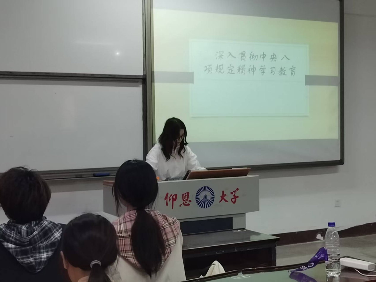 在深化中央八项规定精神学习教育的启动会上,书记武培汾立足全面从严治党主体责任落实,从制度建构、示范引领、过程管控三个维度作出系统性阐释:第一,构建横向贯通、纵向到底的立体化责任体系,形成支委统筹全局、学生党员协同发力的履责机制;第二,强化标杆示范作用,要求学生党员既要做廉政建设的“领头雁”——带头开展廉政专题宣讲、从严从实开展自我检视剖析、科学制定整改任务清单,又要当作风建设的“排头兵”;第三,建立全流程闭环管理机制,通过定期分析研判、专项督导检查、整改成果评估三个关键环节,实现作风建设制度化、规范化、长效化发展。