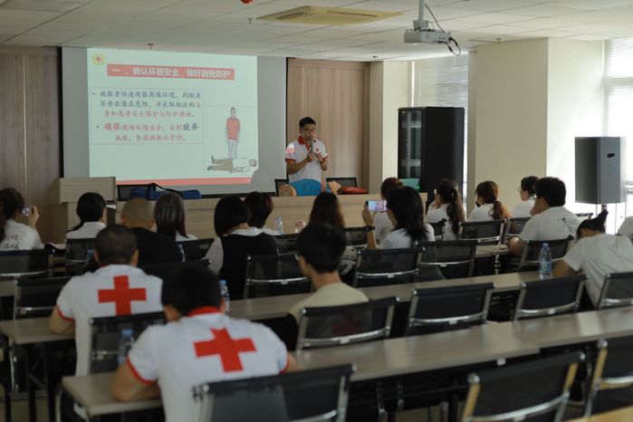 活动现场,红十字服务团的会长化身“生命守护者导师”,用通俗易懂又严谨专业的讲解,带大家推开急救知识的大门。讲解心肺复苏时,从判断意识、开放气道,到胸外按压的深度、频率,讲师一步步拆解示范,同学们围站四周,目光紧锁操作细节;介绍AED使用,讲师清晰说明“开机、贴电极片、分析心律、电击除颤”关键步骤,还结合真实案例强调每一步的生死意义。讲解运动骨折处理,从避免盲目搬动到简易固定方法,干货满满。同学们不再是被动倾听者,而是踊跃参与实操,在模拟人身上反复练习按压,拿着模拟AED模拟紧急场景,讲师们穿梭指导,纠正姿势与流程,现场既有知识的传递,也有实践的火热。交流生活小常识环节,大家分享日常避险经验,让急救意识延伸到生活每个角落。
