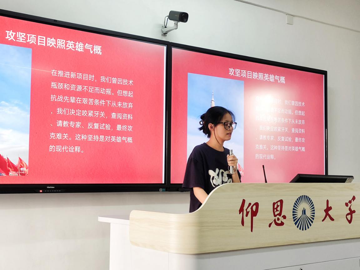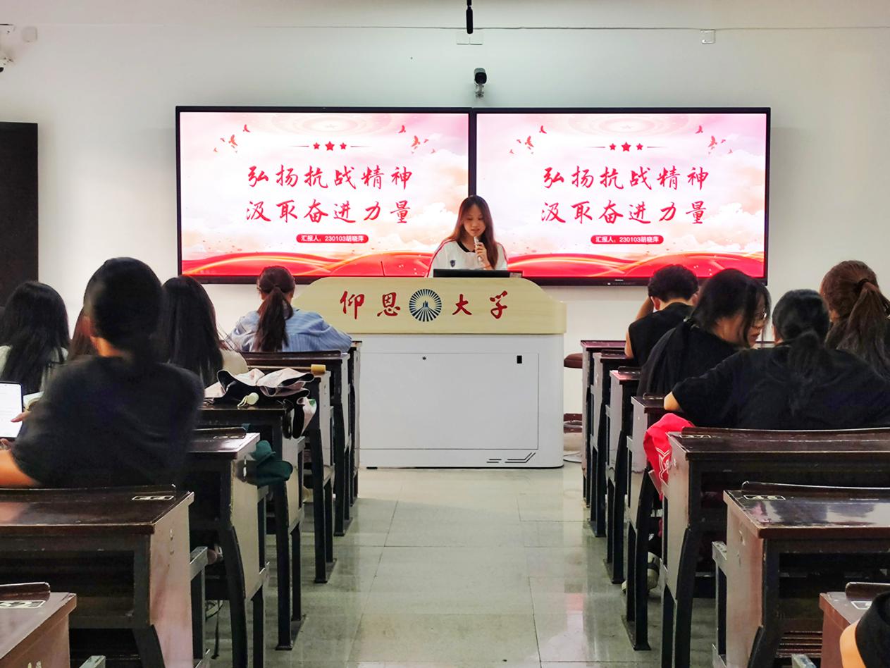 随后,各班积极分子代表上台分享学习体会。胡晓萍同学通过播放抗战视频引入主题,结合自己参观抗战纪念馆的经历,讲述了在馆中看到的珍贵历史文物与照片,感慨如今的和平生活来之不易,号召同学们要以抗战精神为指引,在学习和生活中勇敢面对困难。郑思琪同学从身边长辈讲述的抗战故事出发,分享了自己对家国情怀的理解,表示会将个人成长与国家发展紧密结合。李晨希同学则联系当下的学习生活,谈到要以抗战先烈为榜样,在专业学习上刻苦钻研,为祖国贡献力量。