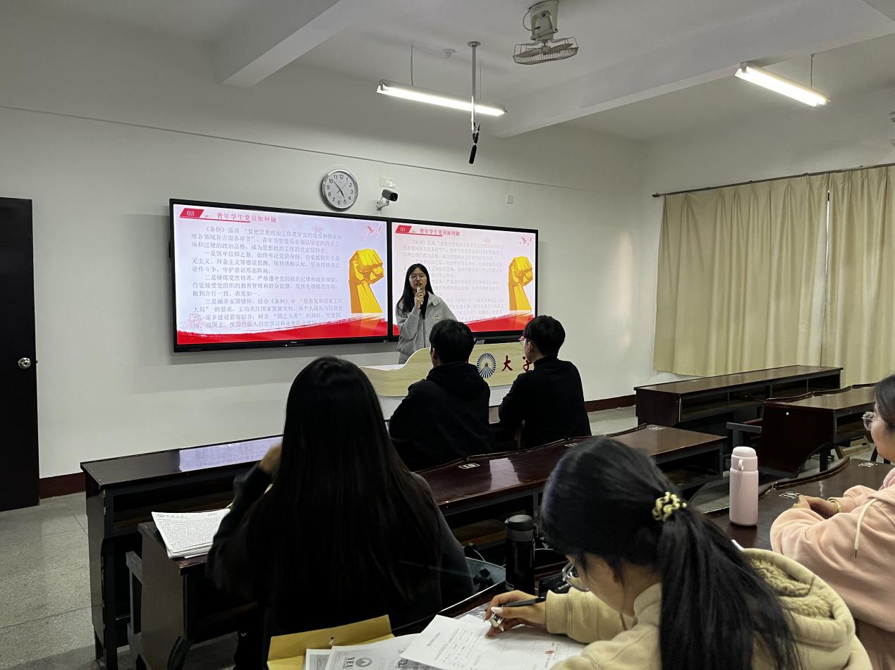 其次,陈嘉雯同学又带着大家明确新时代青年学生在思想政治工作中的责任担当:作为青年学生党员不仅是思想政治工作的重点对象,更应成为先进思想的积极学习者、主动传播者和坚定践行者。要主动将《条例》要求内化于心、外化于行,严格遵守各项纪律规矩,在网络空间和现实学习生活中弘扬主旋律、传播正能量。同时结合学生工作实际,探讨了如何将《条例》精神融入校园文化、学风建设、社会实践、志愿服务及日常言行之中,不断创新学习形式与实践载体,使思想政治工作更贴近青年、更具活力。