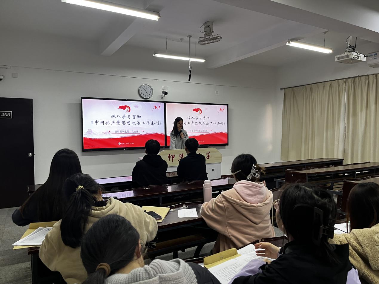 最后,大家纷纷表示,将进一步深化对《条例》的理解把握,持续加强理论武装,坚定理想信念,锤炼高尚品格,练就过硬本领,努力将学习成果转化为勤奋学习、矢志报国的实际行动,争做有理想、敢担当、能吃苦、肯奋斗的新时代好青年,为强国建设、民族复兴伟业贡献青春力量。(经贸系学生第二党支部 林君玲/图文 审核:黄培真)