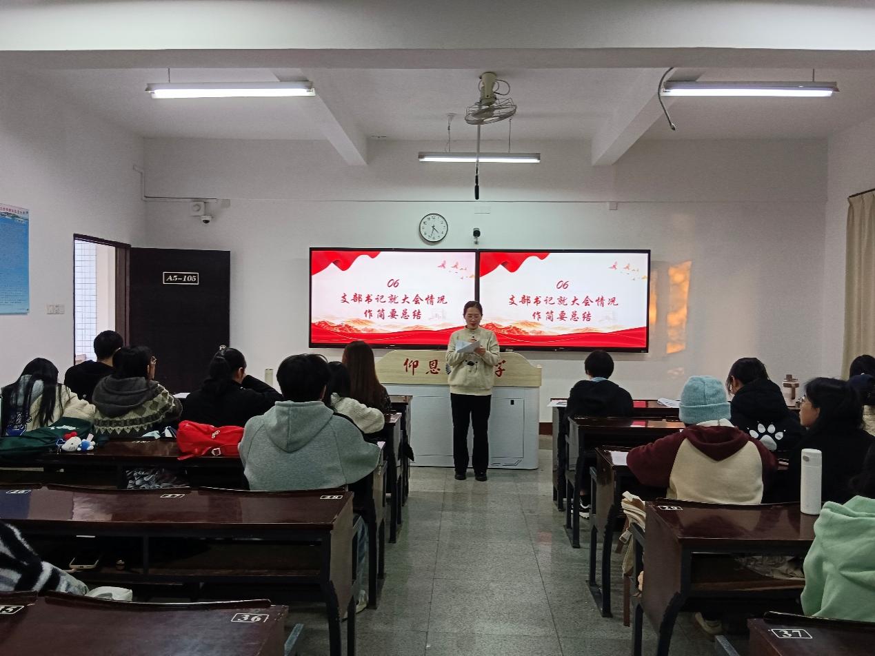 大会尾声,支部书记何丽玲同志作总结讲话。她对转正党员在预备期的表现给予肯定并表示祝贺,呼吁全体党员坚守初心,不断提升党性修养,始终保持政治上的清醒与坚定;在此基础上强化责任担当,将党员身份转化为行动自觉,主动把个人成长融入专业学习与社会实践,以实干精神勇挑重担,切实发挥先锋模范作用。